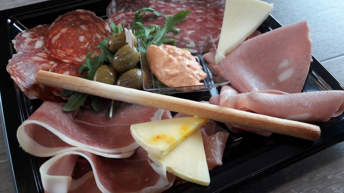 Onze antipasta, Italiaanse tapasschotel, wordt ter plaatse versneden met de Berkel snijmachine om versheid en smaak te garanderen.